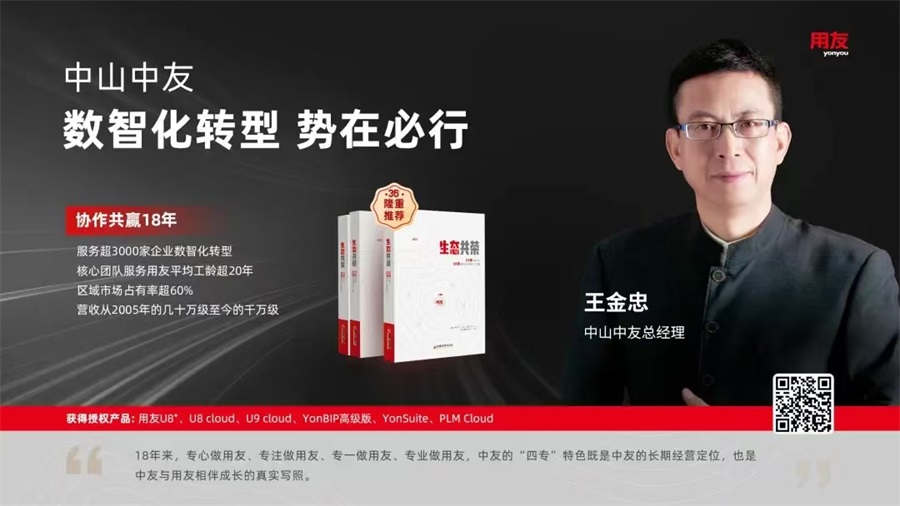 孙总还强调中山中友从05年成立到现在20周年了,在这20年里中山中友一直紧跟用友的步伐,为中山企业提供信息化建设服务,帮助中山几千家企业在信息化建设上给出专业的方案和技术支持。用友在35周年发版一本叫“生态共荣”的书,中山中友也是用友全国合作伙伴中为数不多的被写进这本书的合作伙伴之一。在AI的新时代,用友也会更紧密的和中山中友加强合作,用更高的质量和更专业的水平服务好中山的客户,为中山及周边企业在成功数转这条道路上保驾护航。